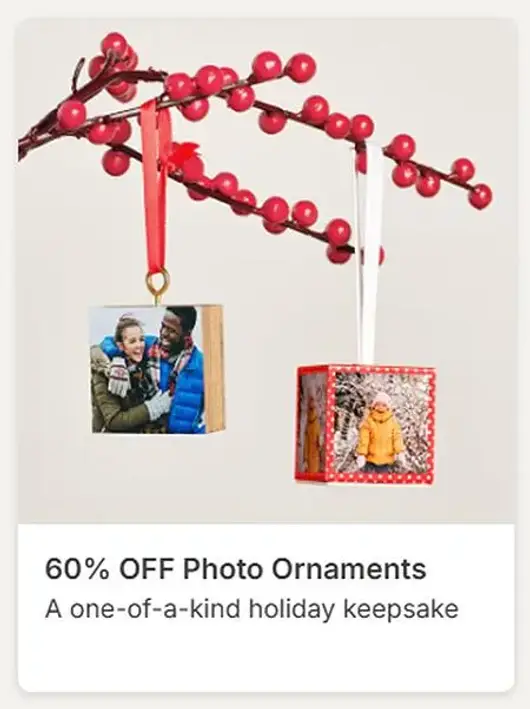 Hurry in and take 60% off on photo ornaments in store for a limited time.