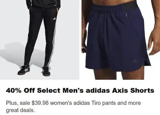 Don't miss this! Shop in store and get 40% off select men's adidas Axis shorts. Plus, sale $39.98 women's adidas Tiro pants and more great deals.