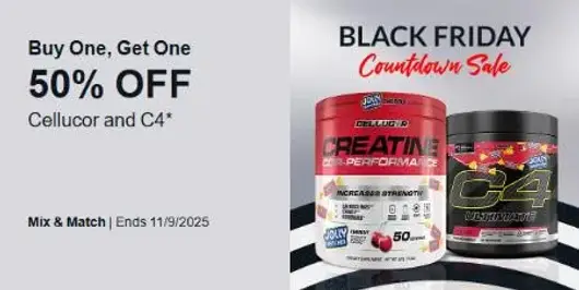 Shop in store and buy one, get one 50% off on Cellucor and C4 products for a limited time.