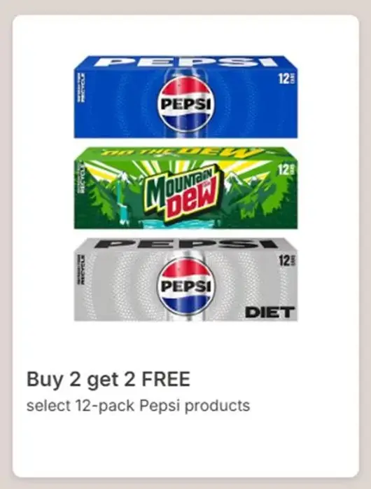 Stop by and buy 2, get 2 free select 12-pack Pepsi products in store.